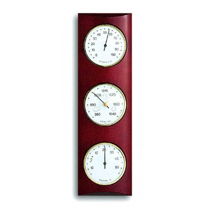 De licht bollende mahonie houten weerstation heeft een hygro-, thermo- en barometer met witte schaalplaatjes.