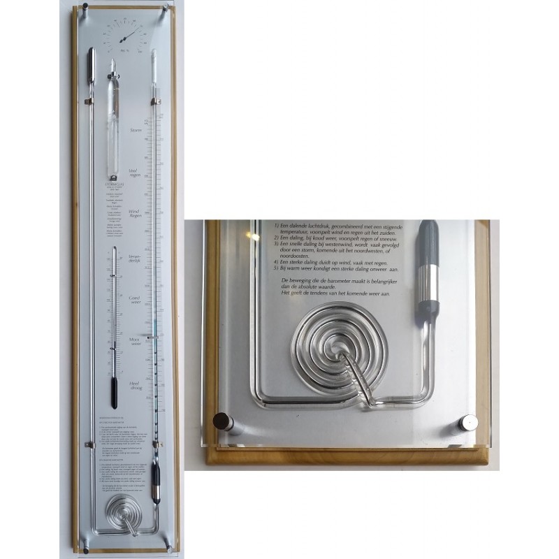 De hygro-, thermo-, barometer en baroscoop zijn op een mat rvs schaalplaat met licht houten achterwand bevestigd. De instrumenten worden beschermd door een glas ( facet geslepen).