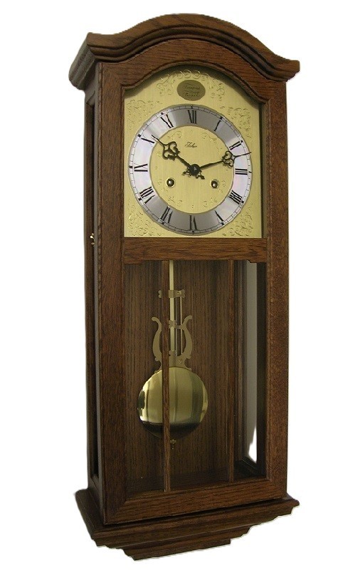 De luxe eiken wandklok met geëtste wijzerplaat heeft een Duits uurwerk met een warme bimbam-..