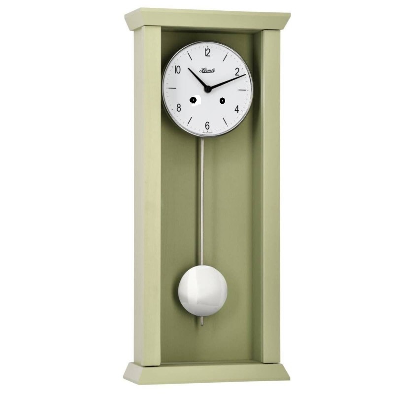 De groene houten wandklok heeft een Duits 8-daags uurwerk met een slagwerk. De klok slaat 1x om het half om en het aantal uren om het heel op een ronde gong. Gehele uitschakeling van het slagwerk is mogelijk. De wijzerplaatring en de slinger zijn verchroomd.