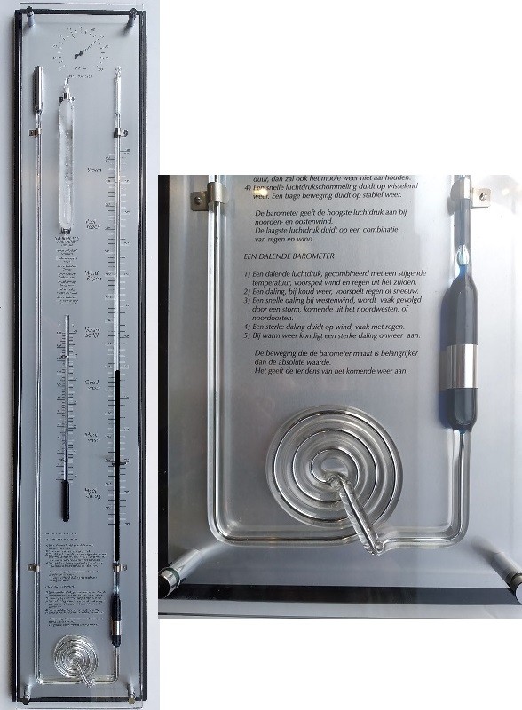 Op de rvs schaalplaat met zwarte achterkant zijn een baroscoop, hygro-, thermo- en contrabarometer aanwezig(= meest uitgebreid). De kwikbarometer heeft een decoratieve krul beneden. De instrumenten worden beschermd door een facet geslepen glas.